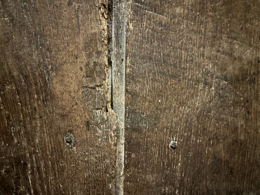 They are oak. They’ve had some abuse. The matching ones a level down are in nice condition. Albeit all have obviously shrunk and exposed the laps.considering they appear to be 25% air and 25% bitumin I would say the lighting, arty as it is is (great photo) isn't that misleading to me! I have seen better 1600s boards but then if you have no replacements, that's pretty rare. I would presume oak as elm or pine would have evaporated even more with no roof.
