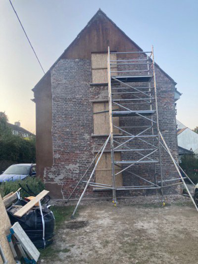 We are right at the beginning of a project, and while we waited for replumbing, etc etc, we have removed cracked cement render from the gable end. This was on top of brickwork, which itself is the external wall to an internal stone one for two of the three floors. The house is a real hodgepodge.