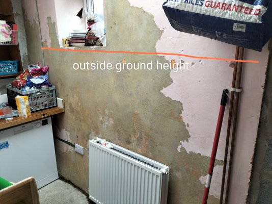 Ideally my first thought was to excavate on the outside, digging down all the way down the length of the utility and down the side of the outisde toilet which is attached to it, but the more I think about it the more I think that this is not feasable. The wall of the utility not behind the pit and of the outside toilet are relatively damp free and having dug down a small amount they are built straight on the rock in the ground, which I would rather not start having to disturb if at all possible.