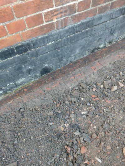 Newbie here seeking advice please. We live in an old cottage (C.1750) that's timber framed, mostly wattle and daub with brick on the outside - the brick has a lower coating of blackjack (applied by a previous owner). Unfortunately a previous owner installed a tarmac style driveway resulting in the outside flooring level being a lot higher than the internal floor. Since we moved in we've had very high levels of humidity and damp on the ground floor walls and so are currently in the process of removing tarmac/soil and have dug deep enough to expose around 2-3 bricks below the blackjack where there is then another coarse of bricks that juts out slightly (possible foundation from when the bricks were added?). Hopefully this removal will help the walls to start to dry out, however my question is whether we eventually should be applying blackjack to the now exposed lower bricks or would this cause more problems and trap moisture in? Advice welcome please, thanks