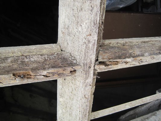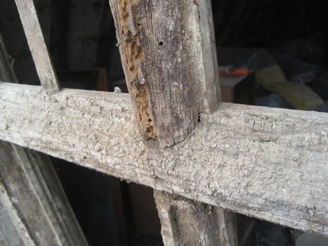 The oak members of the window are very well preserved internally, where they weren't covered with concrete. But externally they are badly rotted and have suffered from (now extinct) infestation by woodworm and DWB. Some of the finer parts of the mouldings are so delicate that they crumble to dust when they're lightly touched (see my pictures below).