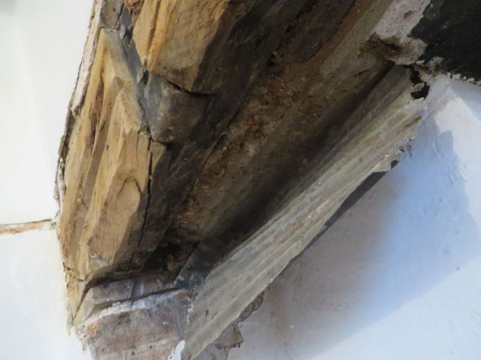 In situ it's not very pretty since the leading edge is visible and I'm hoping it's served it's original role of holding the filling in place while whatever sticks it together hardened. But I've some trepidation about taking it away and then having some sort of collapse next time the house moves a bit...