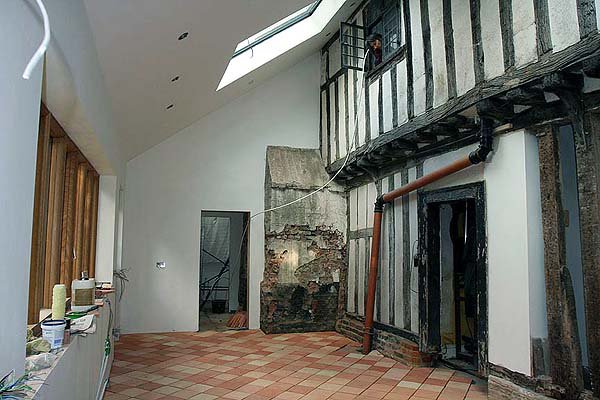 The photo also clearly shows how the original structure has been extensively altered over the years. Many of the original wattle-and-daub panels have been replaced with brick, possibly after various parts of the frame had been cut and altered to accomodate the new windows and door. These were clearly destructive and irreversible alterations, though completely hidden when re-rendered. Also visible are some of the original tudor windows that have been covered up, presumably because they would spoil the symmetry of the new 'Georgian' makeover.