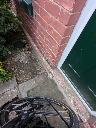 The photo featuring the front door shows how the front step is in rather poor shape, and its shabbiness is what got me investigating by cutting the shrubs right back away along the wall.