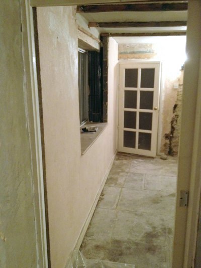 The front wall (ashlar stone, rubble interior, solid wall c.1700) remains damp in places at low levels on the inside. Now, while I expect this is probably the result of condensation, we had suspected that there may have been an interior 'skin' built inside this wall (as the wall is 9 inches thicker downstairs than upstairs and plastered in very flat gypsum).
