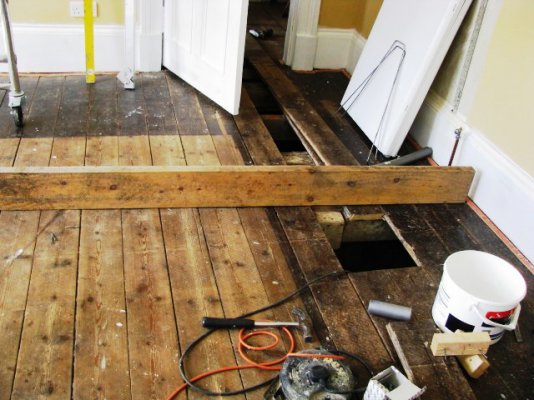 The original joist was 6" * 3" and had been cut and badly repaired So after a think l realised l had a 6.5 inch * 2" joist and there was a supporting wall halfway across the dinning room floor. There was also a trap lifted the other side of the support floor. So l went down the gap knocked a hole through. Manoeuvred the joist in place by bringing it in through the window through the trap and through the supporting wall, and bolted it to the existing joist. Just need to pop back under the boards today and rebuild the support wall so there is a decent pad for the joist to sit on.